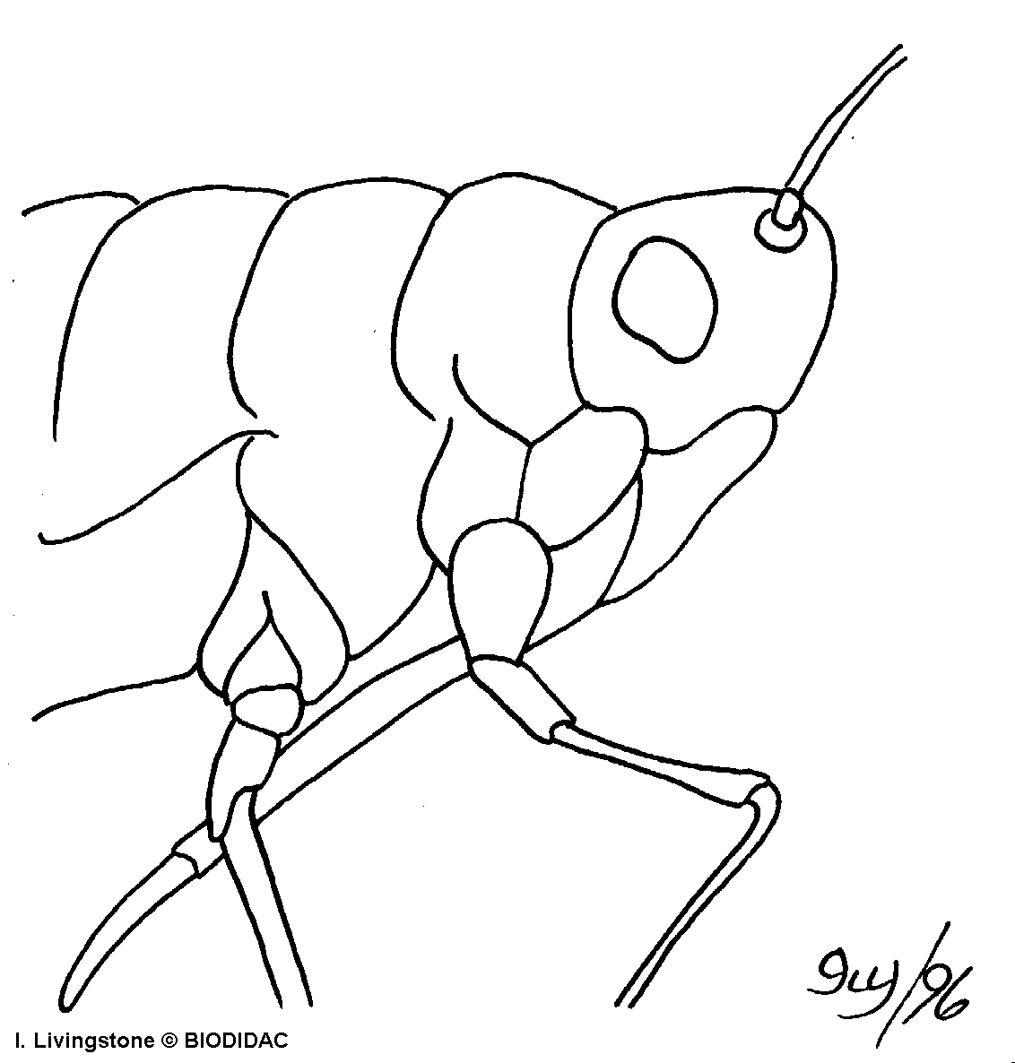 (FR) : Pièces buccales : Insecte opistognathe dont la tête est orientée obliquement et les pièces buccales sont pointées ventro-postérieurement vers l'arrière. Exemples de ces insectes sont les cicadelles, les pucerons et les aleurodes.