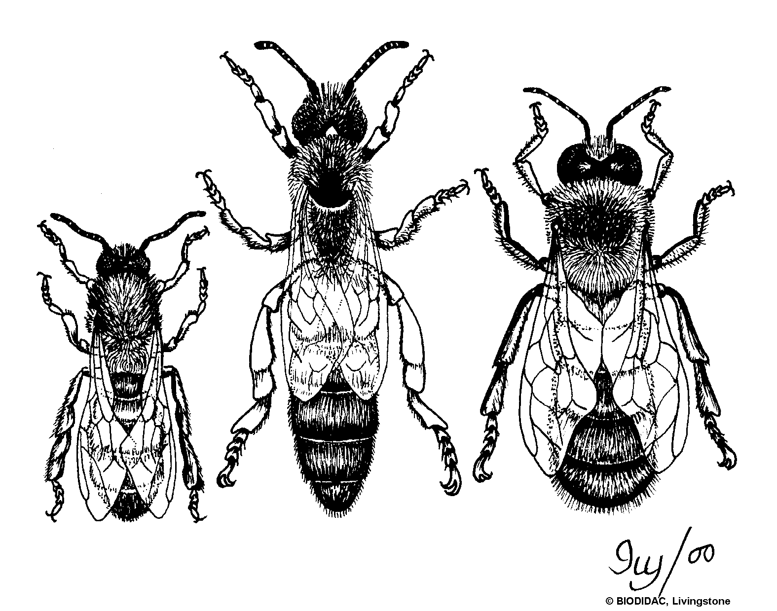 (EN) : External anatomy (dorsal view): Worker (left), drone (middle), and queen (right).