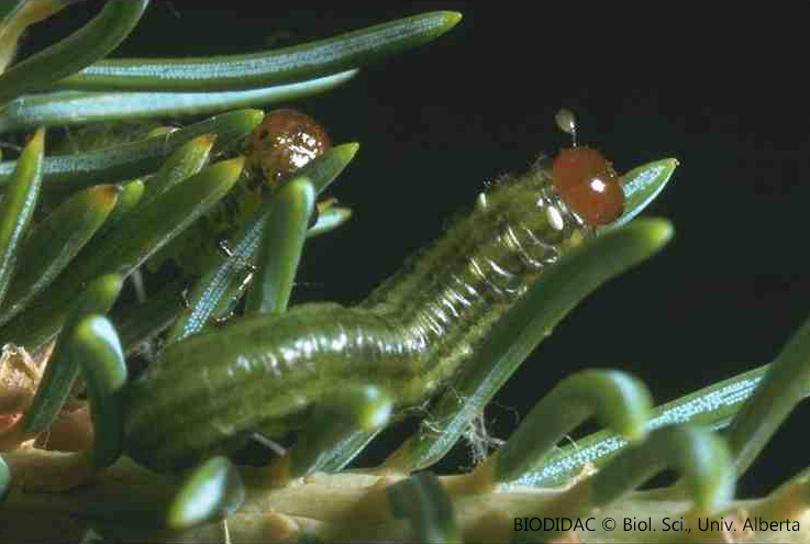 (EN) : Larva feeding on a needle, a destructive pest of spruce.