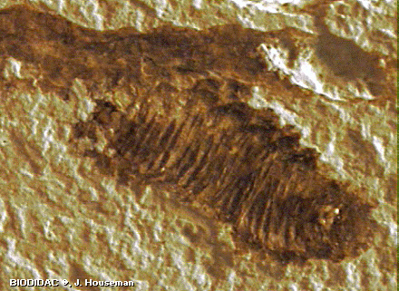 (EN) : Unidentified insect larva from the Eocene period: It is compressed on bedding surface of sediment, was possibly attached to a plant fragment and was retrieved from Colorado, United States.