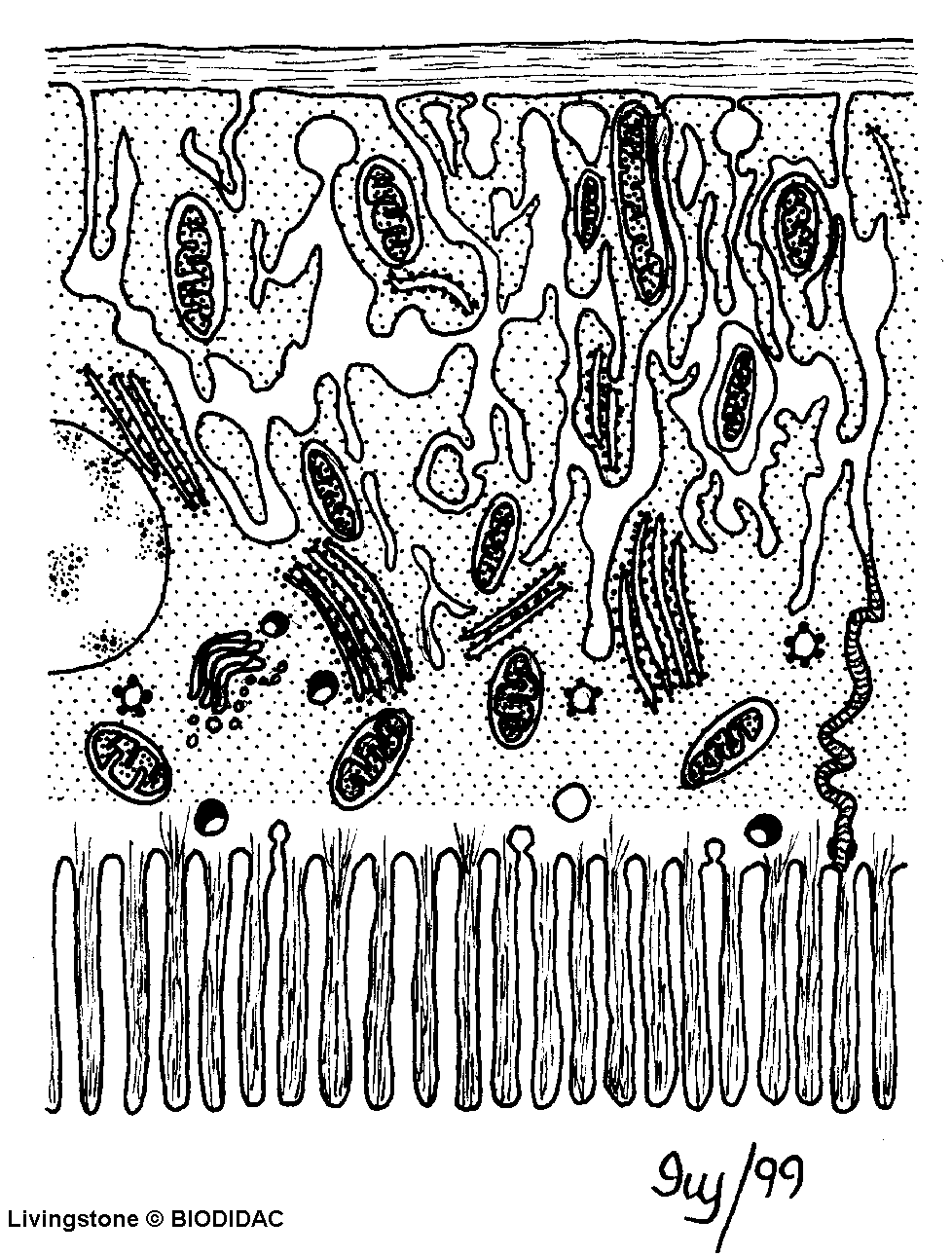 (EN) : Midgut: General features of a typical columnar cell, which is the most abundant type of midgut epithelial cells and is specialized for nutrient absorption and enzyme secretion, with its microvilli and folds to increase its surface area.