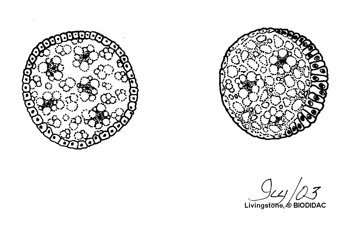 (FR) : Coupe transversale d'un embryon en développement : Formation du blastoderme (à gauche) et après la formation de la bande germinale (à droite).