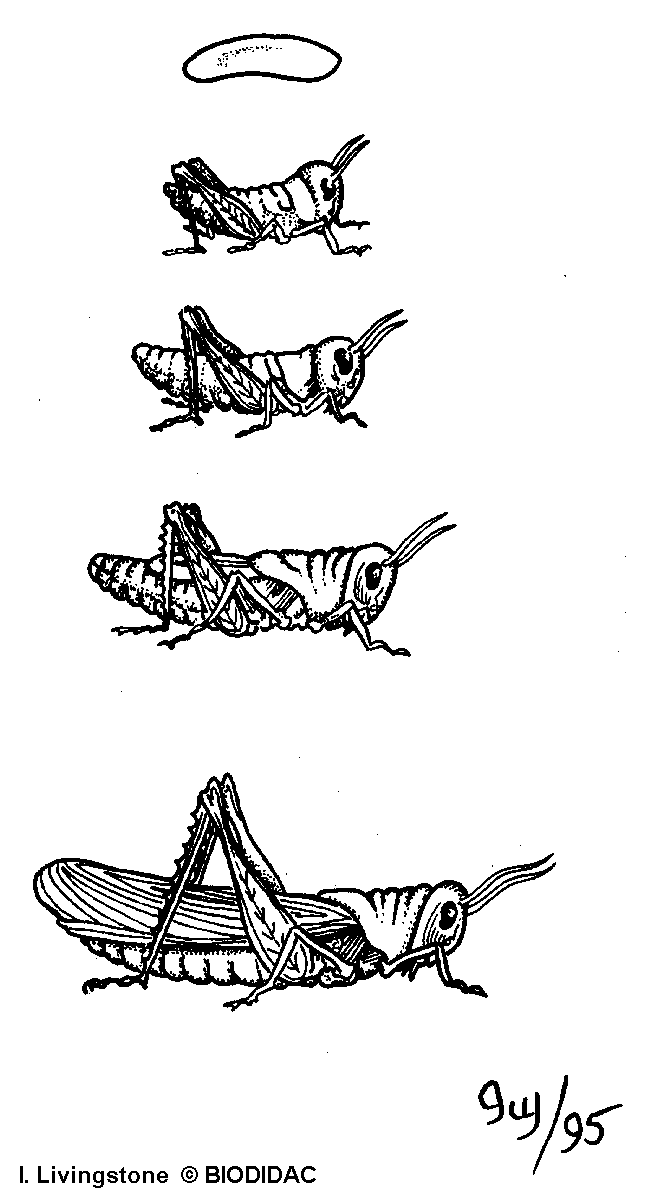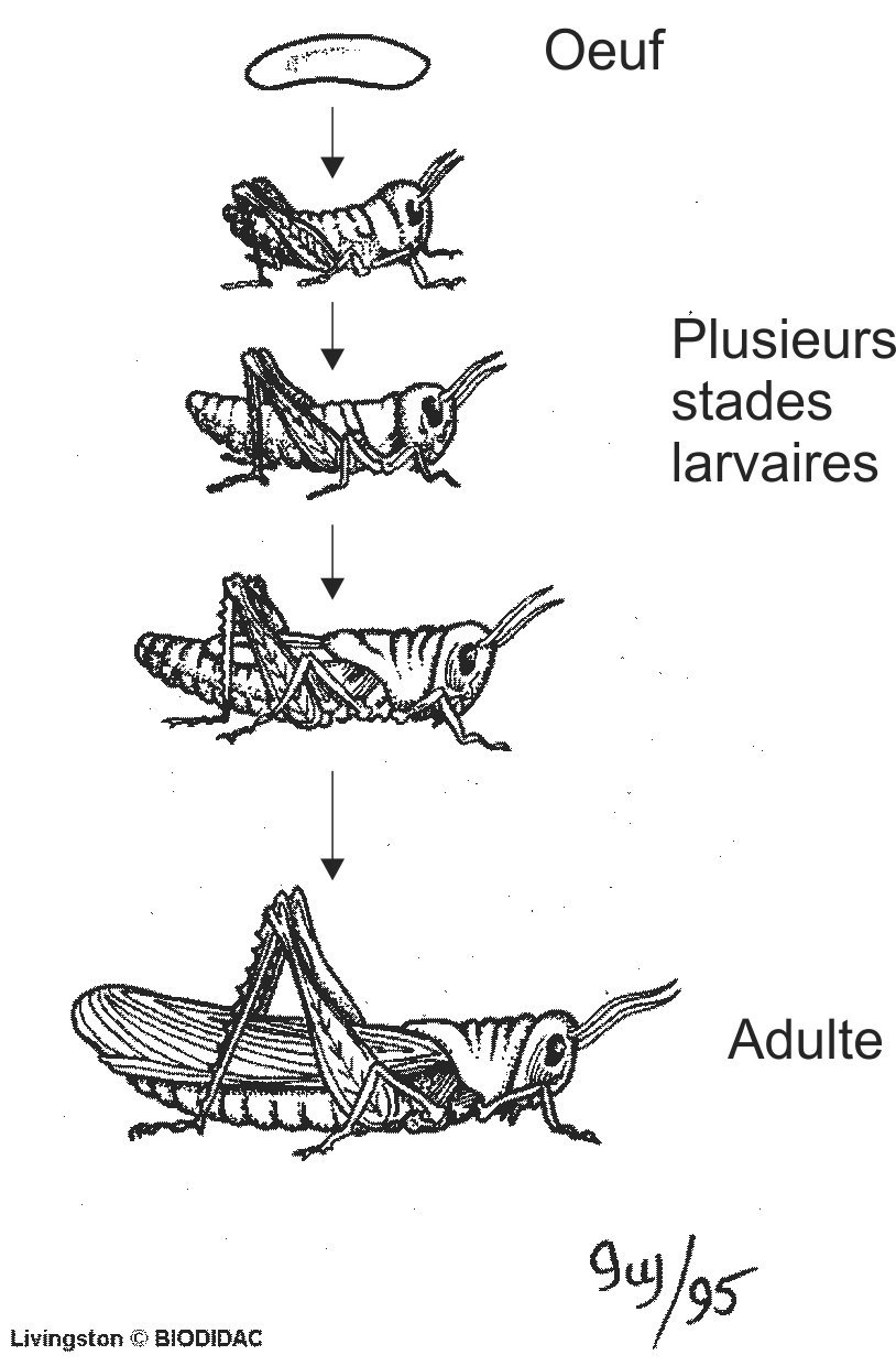 (EN) : Stages from an incomplete metamorphosis (grasshopper as an example). No labels (image 1) + English labels (image 2) + French labels (image 3).