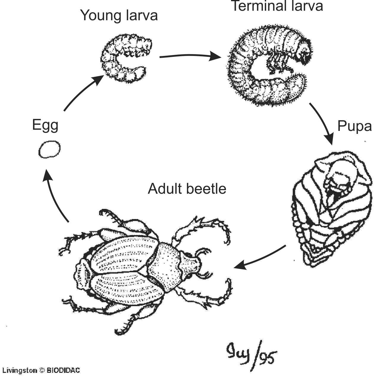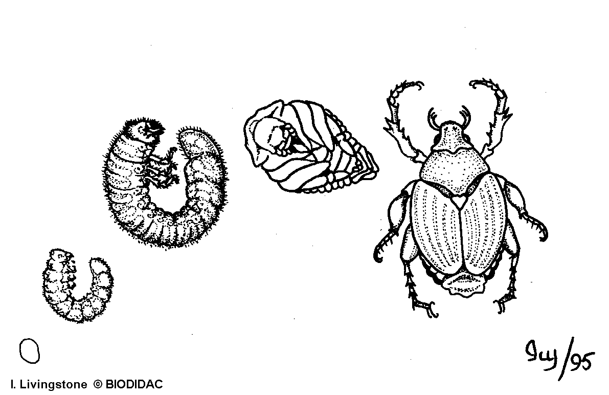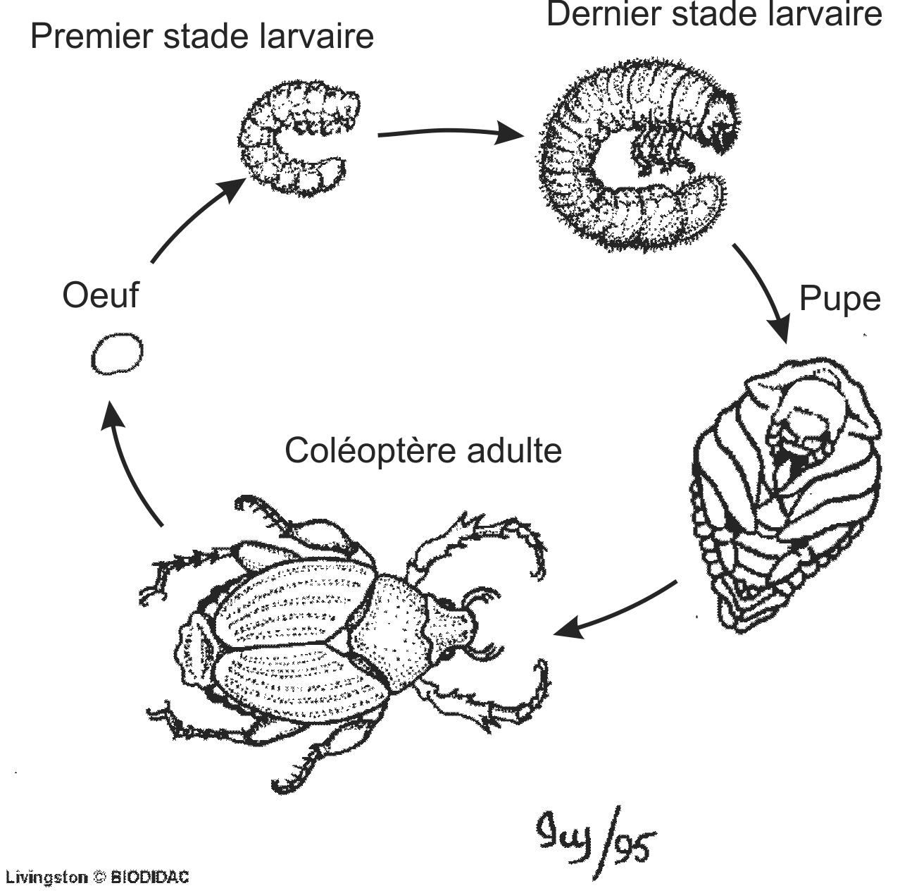 Labels (EN) : Adult beetle, Pupa, Terminal larva, Young larva, Egg