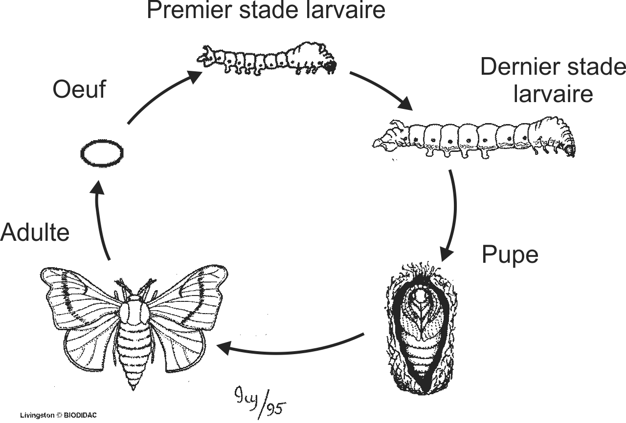 Étiquettes (FR) : Pupe, Dernier stade larvaire, Premier stade larvaire, Oeuf, Adulte