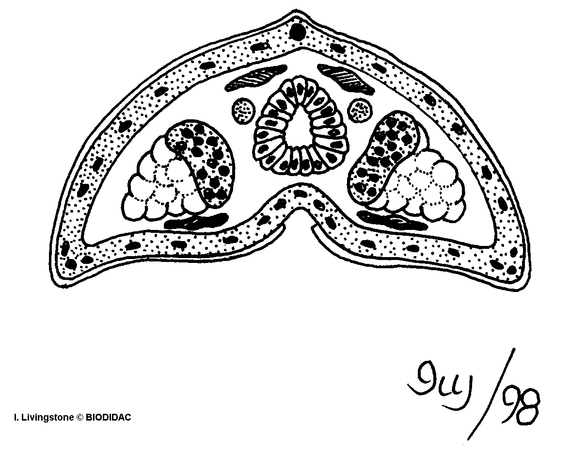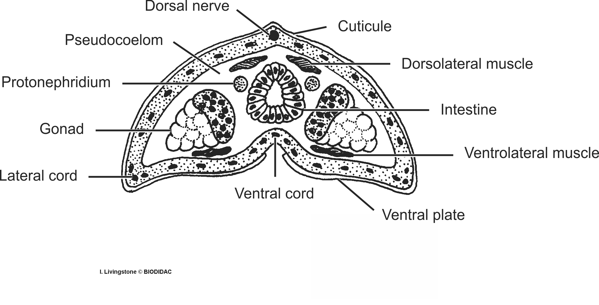 Labels (EN) : Cuticule, Dorsolateral muscle, Intestine, Ventrolateral muscle, Ventral plate, Ventral cord, Dorsal nerve, Pseudocoelom, Protonephridium, Gonad, Lateral cord