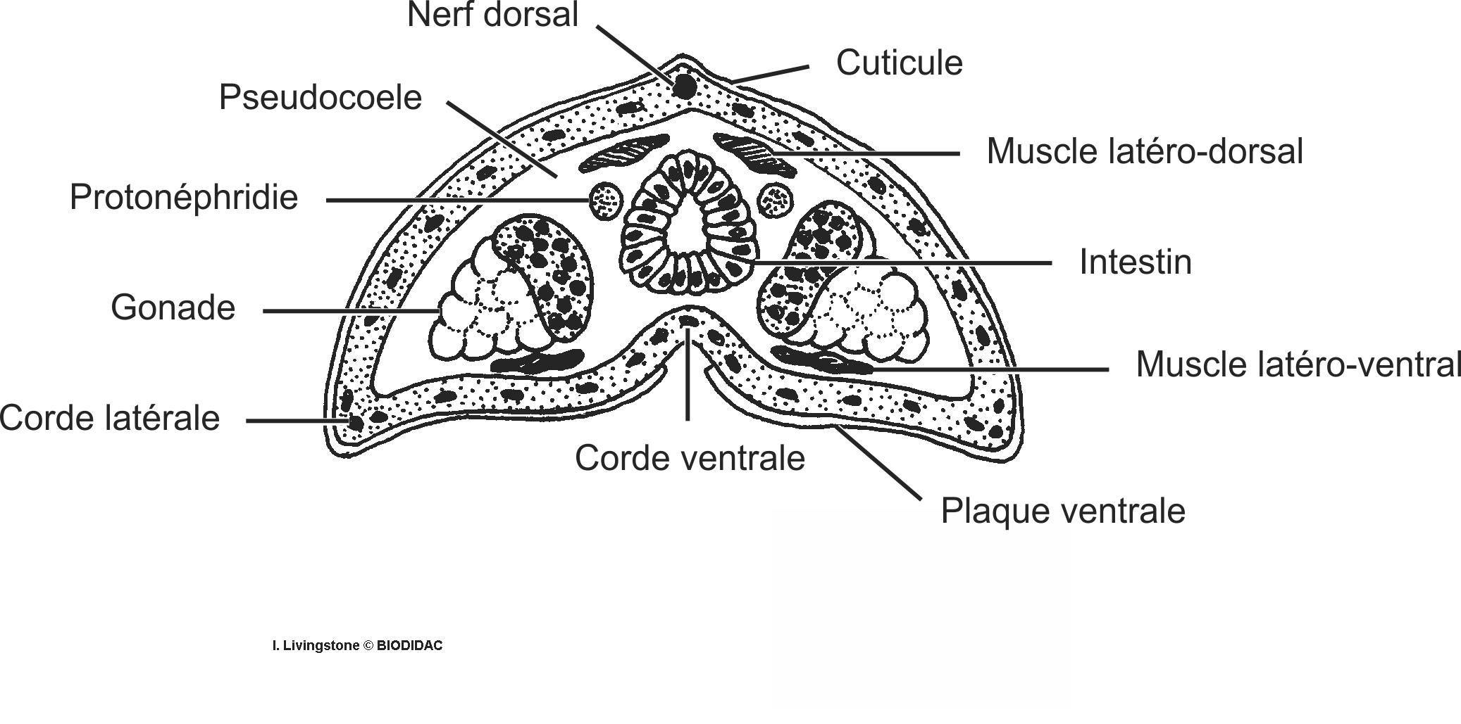 Étiquettes (FR) : Cuticule, Muscle latéro-dorsal, Intestin, Muscle latéro-ventral, Plaque ventrale, Corde ventrale, Nerf dorsal, Pseudocoele, Protonéphridie, Gonade, Corde latérale