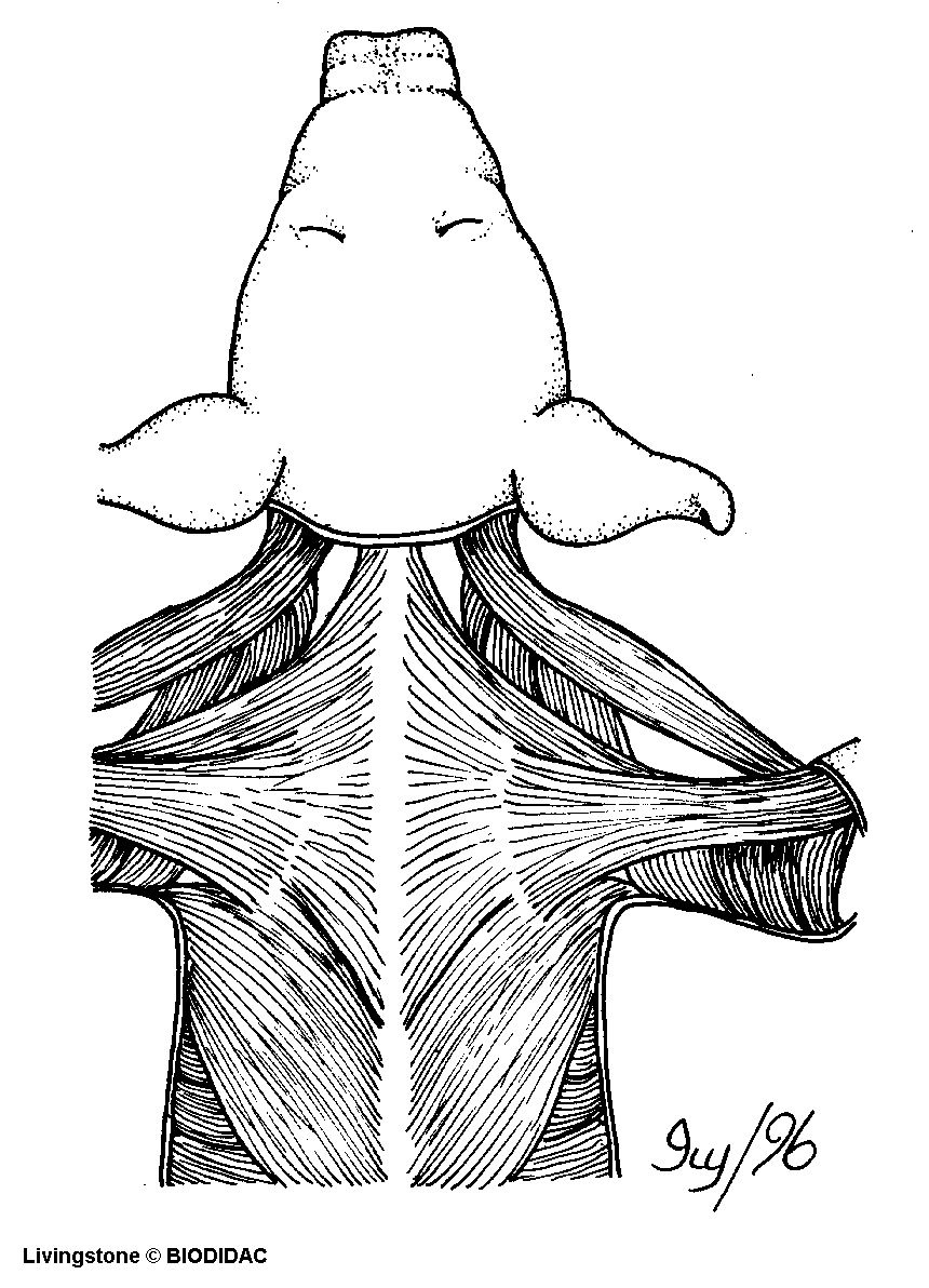 (EN) : Fetal pig: Muscles on the dorsal side of the thoracic region and forelimbs.