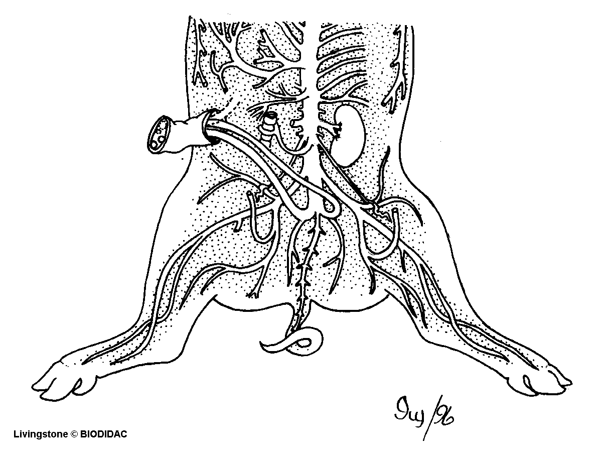 (EN) : Fetal pig: Ventral view of the venous circulatory system of the posterior region.