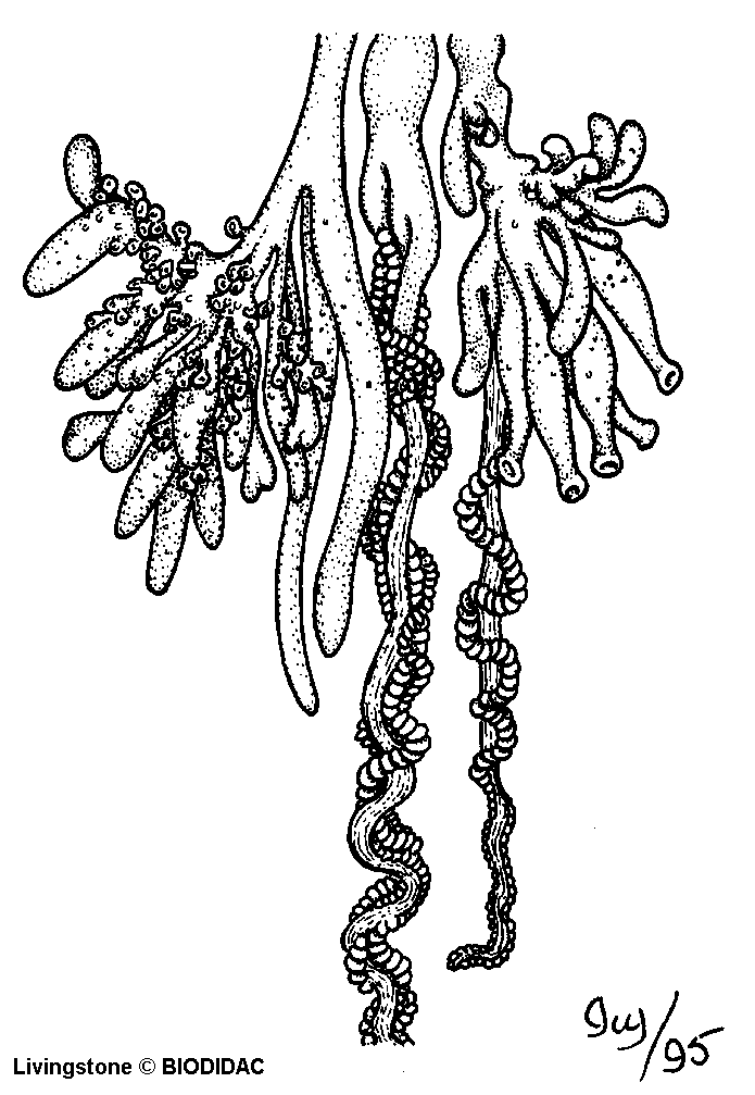 Labels (EN) : Reproductive polyp, Gonozooids, Dactylozooids, Gastrozooids
