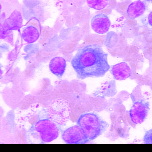 (EN) : Giemsa-stained imprint of an adult rabbit spleen (100x, Slide 36-167 D4-II1g): Whole-celled plasmocytes, basophilic cytoplasm, eccentric nucleus, and juxtanuclear apparatus are visible.