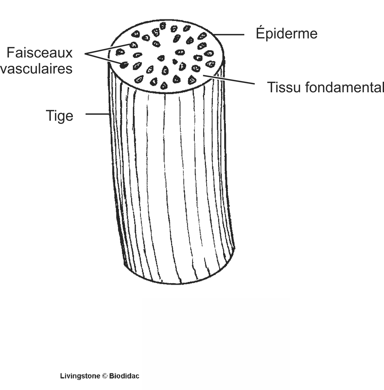 Étiquettes (FR) : Épiderme, Tissu fondamental, Faisceaux vasculaires, Tige