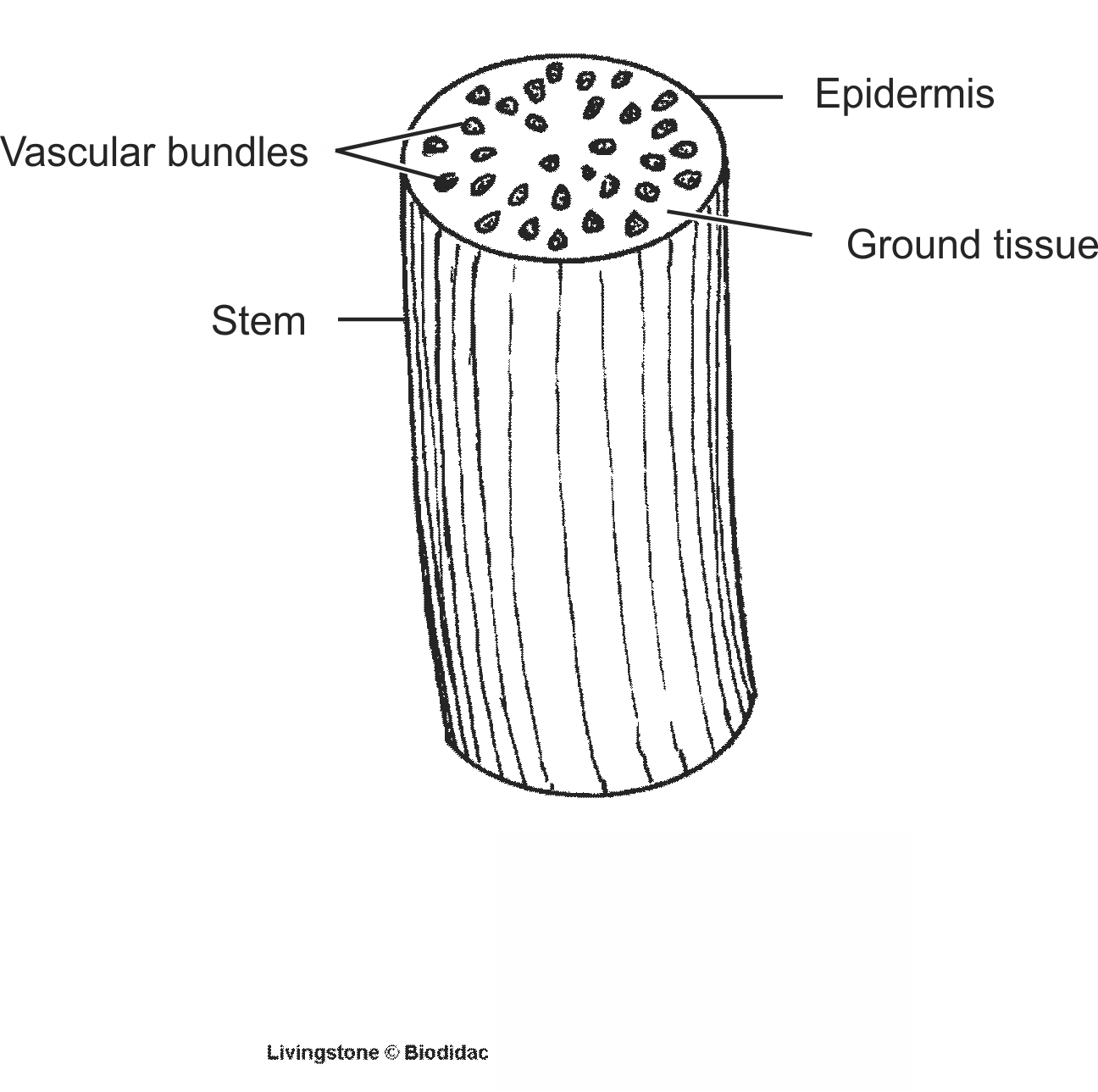 Labels (EN) : Epidermis, Ground tissue, Vascular bundles, Stem