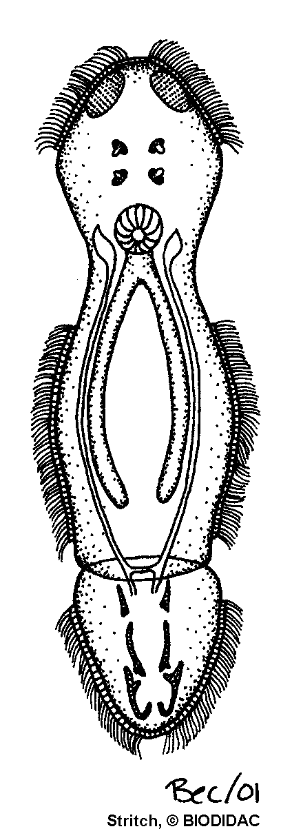(FR) : Larve d'oncomiracidium: Caractéristiques principales. C'est une larve libre caractérisée par son extérieur cilié, ses crochets sclérotisés et son organe adhésif, ou hapteur, à son extrémité postérieure qui sert a se fixer.