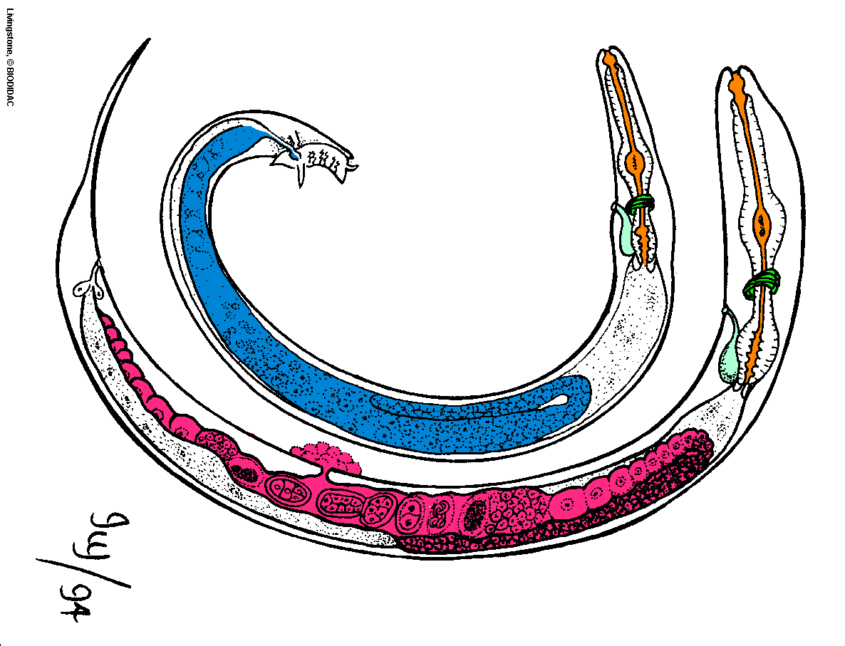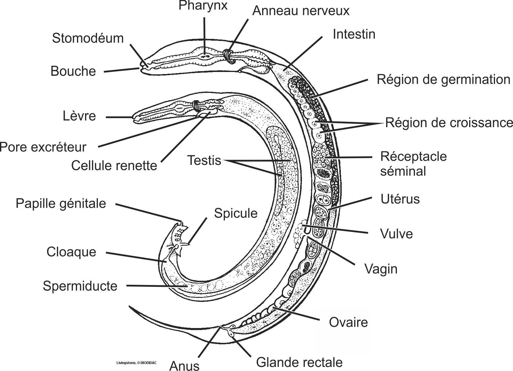 Étiquettes (FR) : Testis, Cellule renette, Pore excréteur, Lèvre, Stomodéum, Bouche, Spicule, Papille génitale, Cloaque, Spermiducte, Anus, Glande rectale, Ovaire, Vulve, Vagin, Utérus, Réceptacle séminal, Région de croissance, Région de germination, Intestin, Anneau nerveux, Pharynx