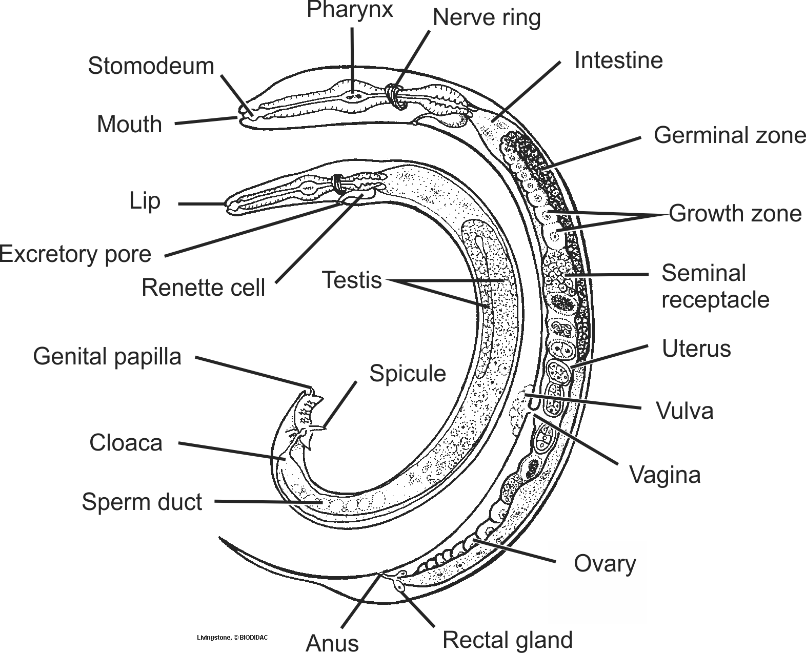 Labels (EN) : Testis, Renette cell, Excretory pore, Lip, Stomodeum, Mouth, Spicule, Genital papilla, Cloaca, Sperm duct, Anus, Rectal gland, Ovary, Vulva, Vagina, Uterus, Seminal receptacle, Growth zone, Germinal zone, Intestine, Nerve ring, Pharynx