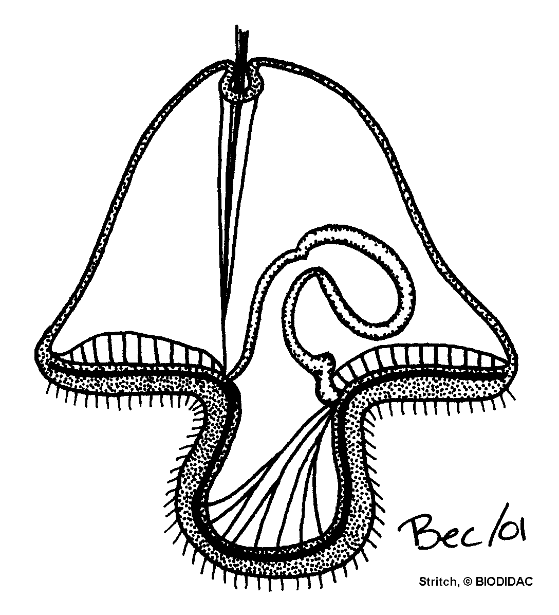(FR) : Larve de pilidium: Caractéristiques principales. Il s'agit d'une larve planctotrophe caractérisée par une forme de casque distincte et un processus de développement où le ver juvénile se développe à partir des disques imaginaux et fait éruption à travers, et consomme souvent, le corps larvaire pendant la métamorphose.