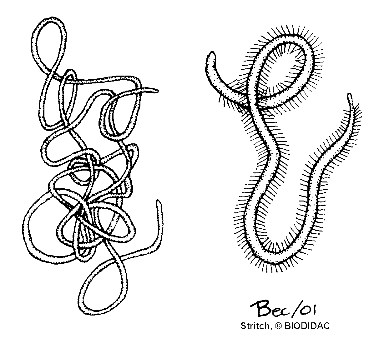 (EN) : External anatomy: Comparison of the main characteristics between a gordiid (genus: Gordius, left) and nectonematid (genus: Nectonema, right).