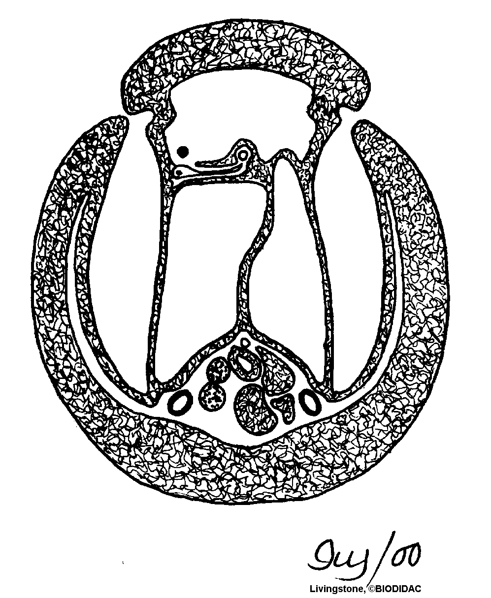 (EN) : Internal anatomy: Cross section showing the general features of the leg, including the tympanum. The tympanum is located on each foreleg, specifically below the knee of the tibia.