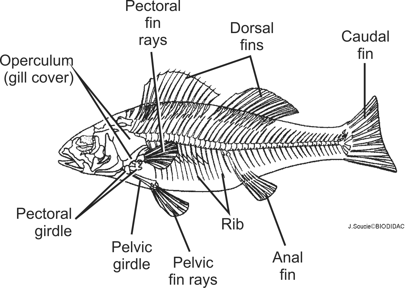 Étiquettes (FR) : Nageoire anale, Nageoire caudale, Nageoires dorsales, Opercule, Ceinture pectorale, Ceinture pelvienne, Raies de la nageoire pectorale, Raies de la nageoire pelvienne, Côtes