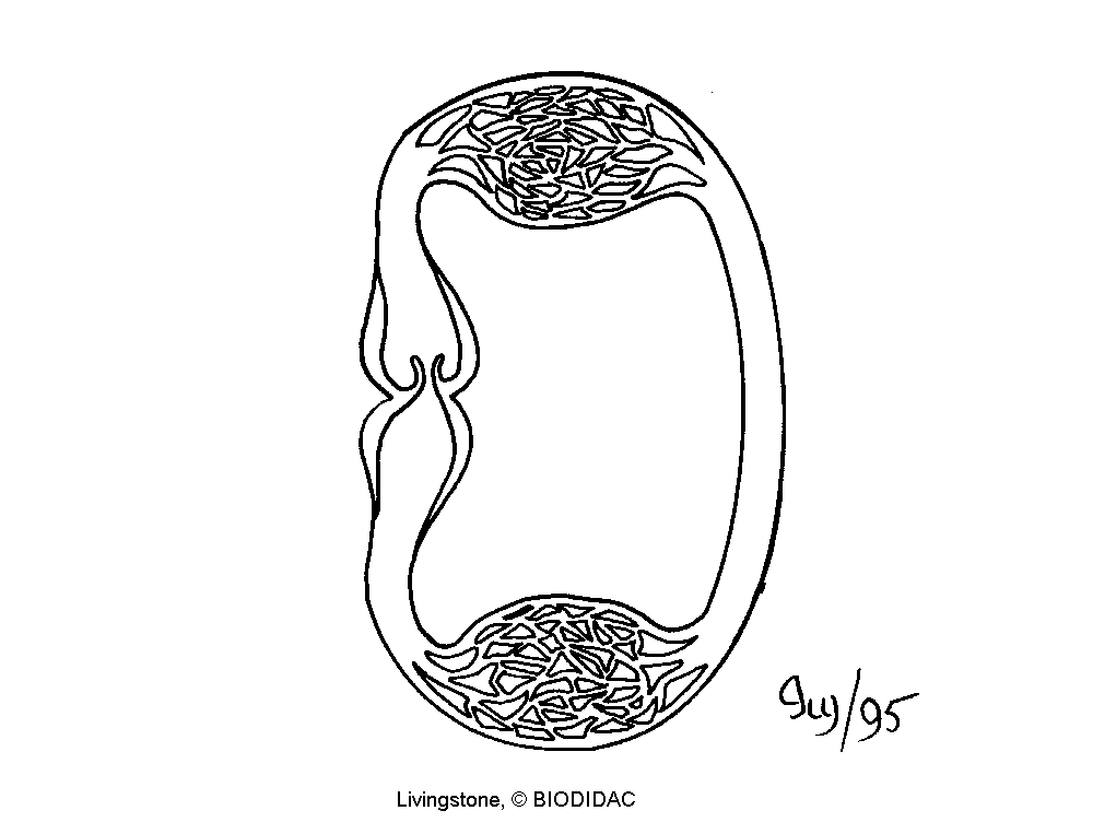 (FR) : Anatomie interne: Caractéristiques principales du système circulatoire. Ce système est composé d’un cœur à deux chambres (oreillette et ventricule), de vaisseaux sanguins et de branchies.