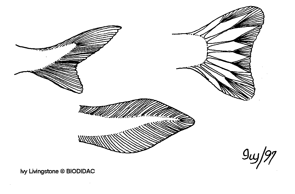 (EN) : External anatomy: Different morphologies of the tail (caudal fin) including forked (top-left), truncate (top-right), and pointed (bottom-centre).