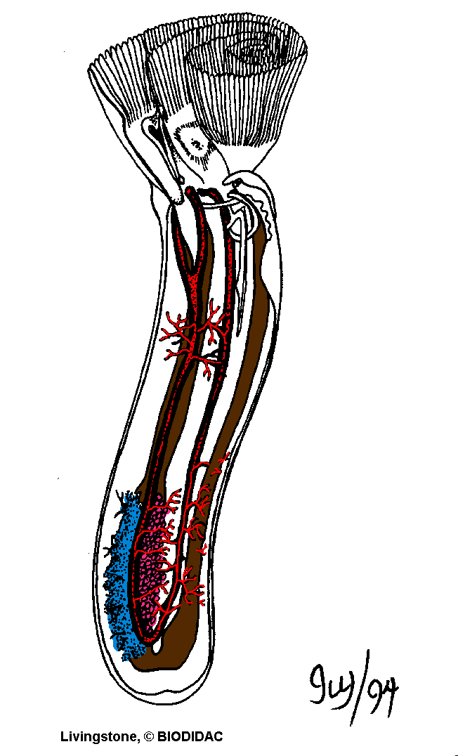 Labels (EN) : Intestine, Ovary, Testis, Capillary caeca, Stomach, Intestine, Afferent vessel, Nephridium, Anus, Nephridial ridge, Oesophagus, Efferent vessel, Mouth, Haemal ring, Mesentery, Epistome, Inner and outer lophophoral tentacles