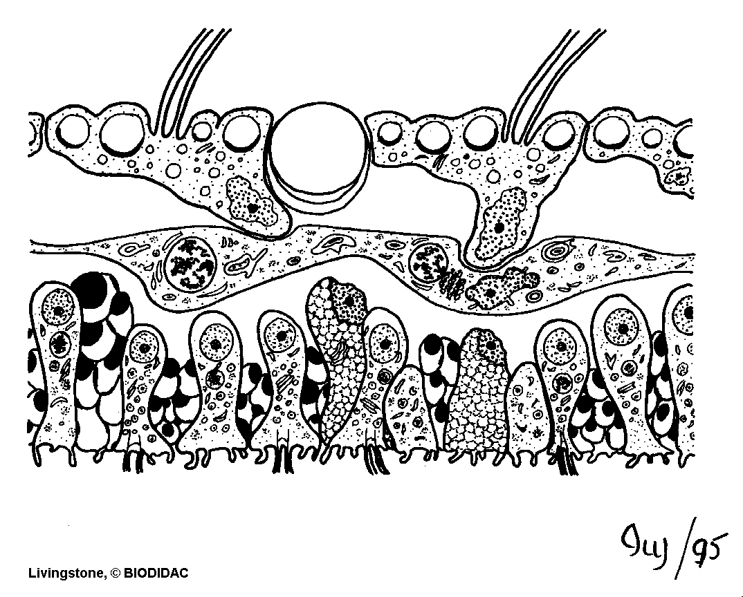 Étiquettes (FR) : Globule réfractile, Cellule dorso-épithéliale, Cellule fibrillaire, Flagelle, Cellule flagellaire, Cellule glandulaire, Flagelle