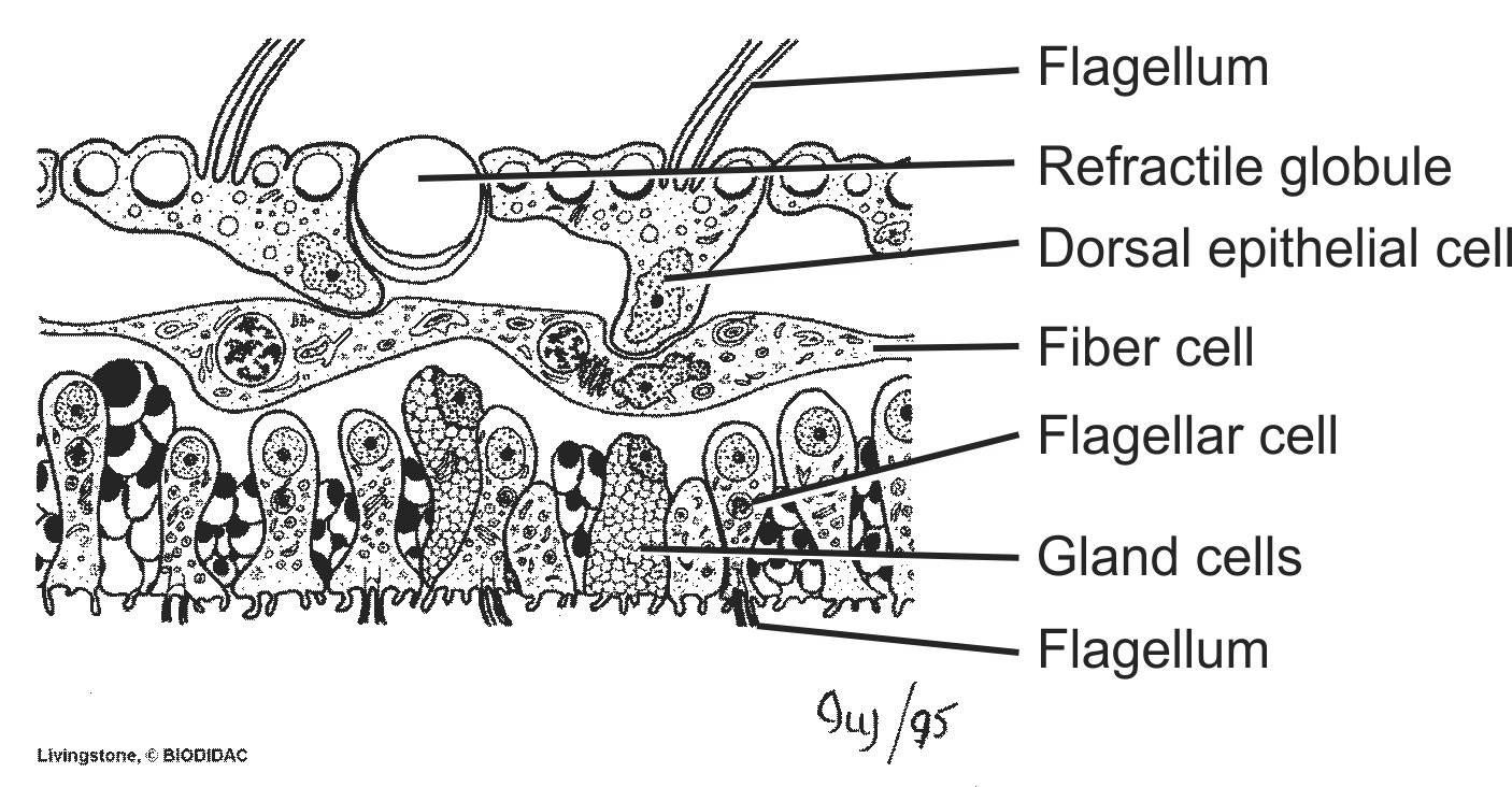 Labels (EN) : Refractile globule, Flagellum, Gland cells, Flagellar cell, Fiber cell, Dorsal epithelial cell, Flagellum