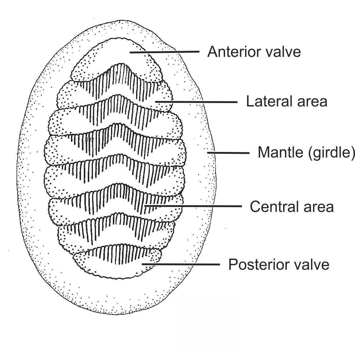 Labels (EN) : Central area, Posterior valve, Mantle (girdle), Lateral area, Anterior valve