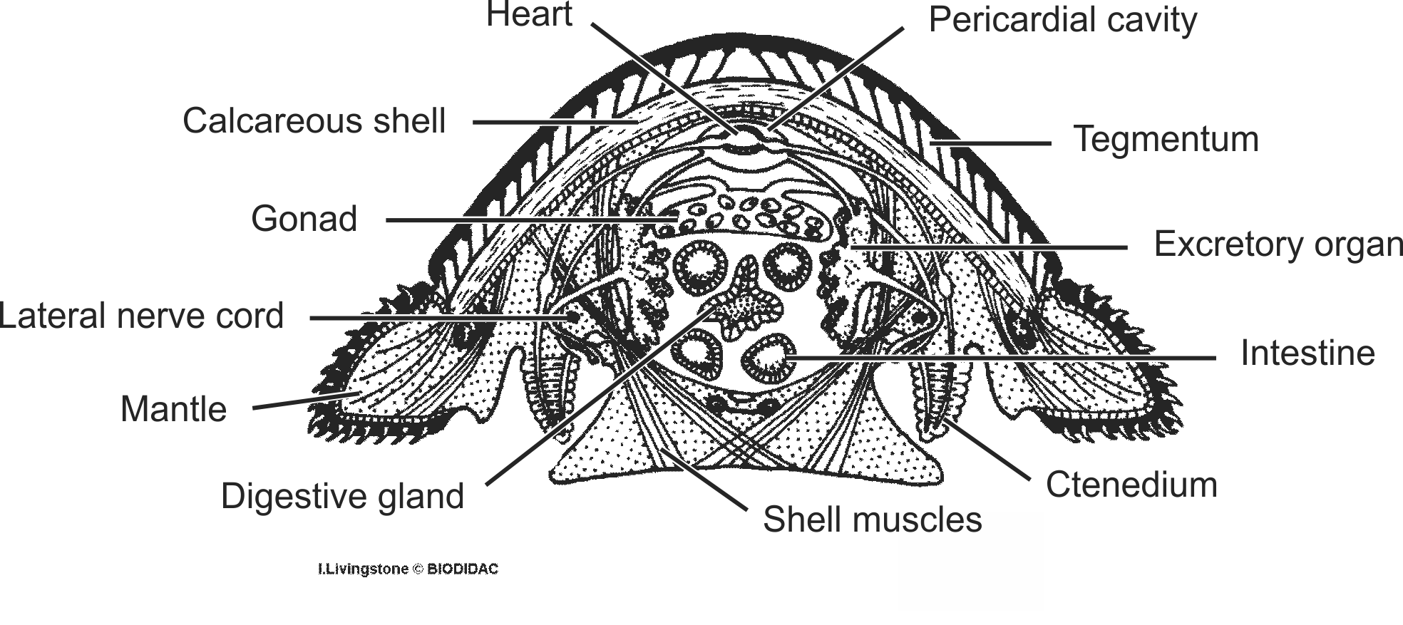 Labels (EN) : Pericardial cavity, Tegmentum, Excretory organ, Intestine, Ctenedium, Shell muscles, Digestive gland, Heart, Calcareous shell, Gonad, Lateral nerve cord, Mantle