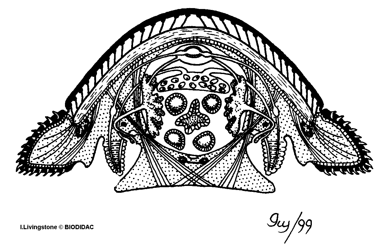 Étiquettes (FR) : Cavité péricardique, Tegmentum, Organe excréteur, Intestin, Cténédie, Muscles de la coquille, Glande digestive, Coeur, Coquille calcifiée, Gonade, Cordon nerveux latéral, Manteau