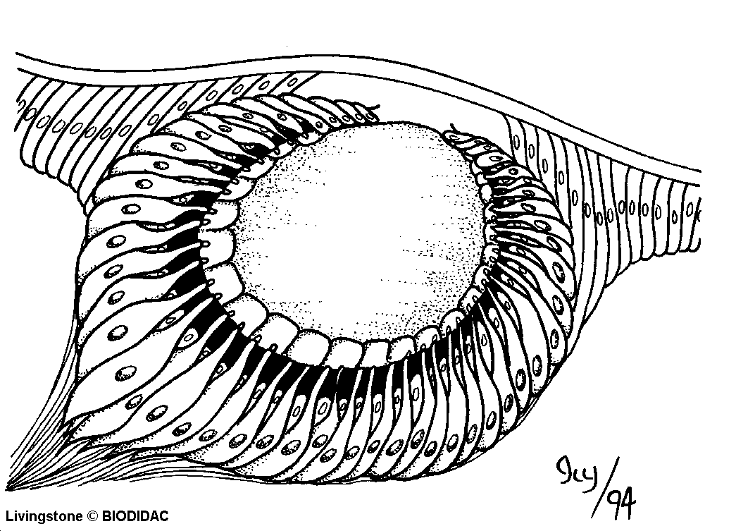 (FR) : Œil en coupe pigmentaire (ou ocelle en coupe pigmentaire) : Il se caractérise par une structure en forme de coupe (coupe pigmentaire) constituée d'une couche de cellules photoréceptrices (pigmentées). La coupe pigmentaire aide à diriger la lumière vers les cellules photoréceptrices, permettant au ver de détecter la direction de la lumière.