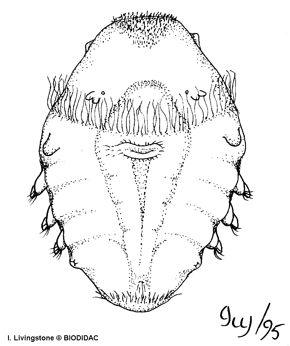 (EN) : Trochophore larva: General external features. It is a free-swimming, pear-shaped larval stage in the development of many polychaete worms and it is characterized by a ring of cilia (called the prototroch), which aids in locomotion and feeding. Polychaete larvae typically progress through three stages, trochophore, metatrochophore, and nectochaete, before settling as adults.