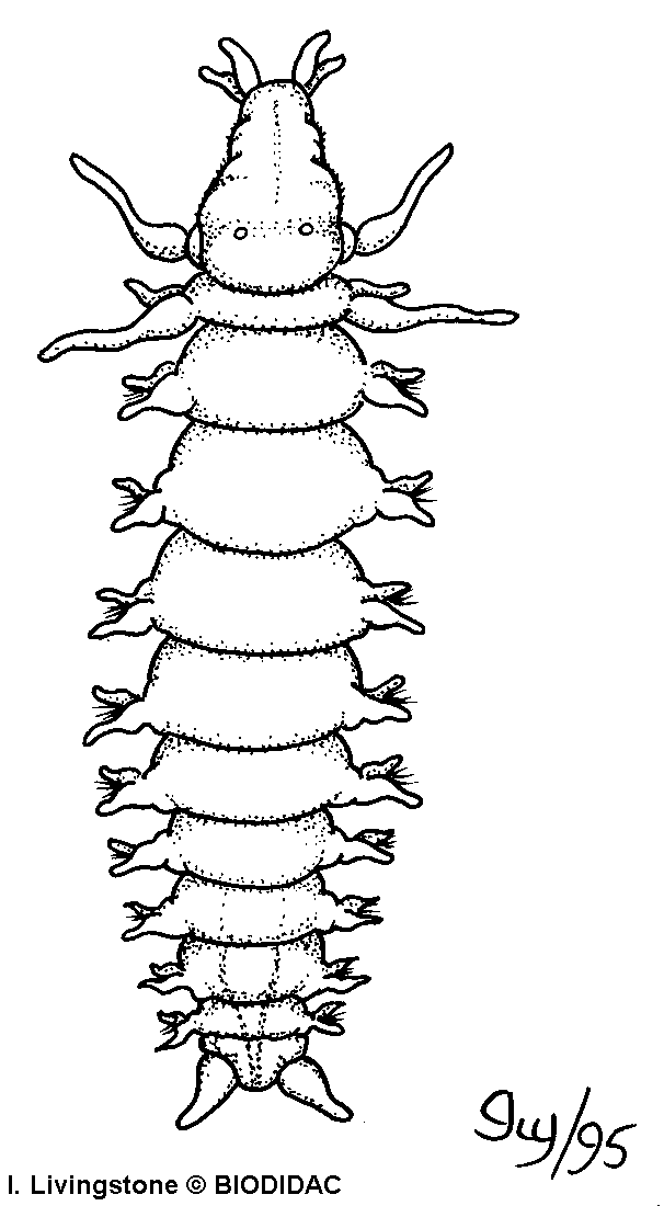 (EN) : Nectochaete larva: General external features. It is larval a stage in the life cycle of many polychaete worms, characterized by the development of setae (bristles) and parapodia (appendages used for locomotion). Polychaete larvae typically progress through three stages, trochophore, metatrochophore, and nectochaete, before settling as adults.