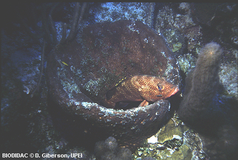 (FR) : Spécimen non identifié avec des mérous : Photo prise en mars 1994 dans Shark Hotel, Providenciales, Iles Turquoises.