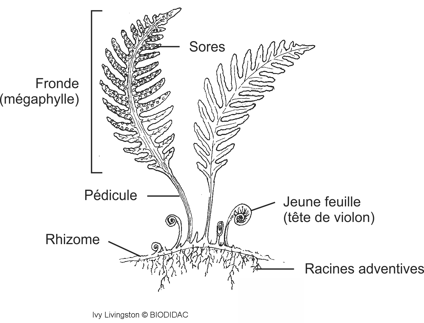Étiquettes (FR) : Racines adventives, Jeune feuille (tête de violon), Fronde (mégaphylle), Rhizome, Pédicule, Sores