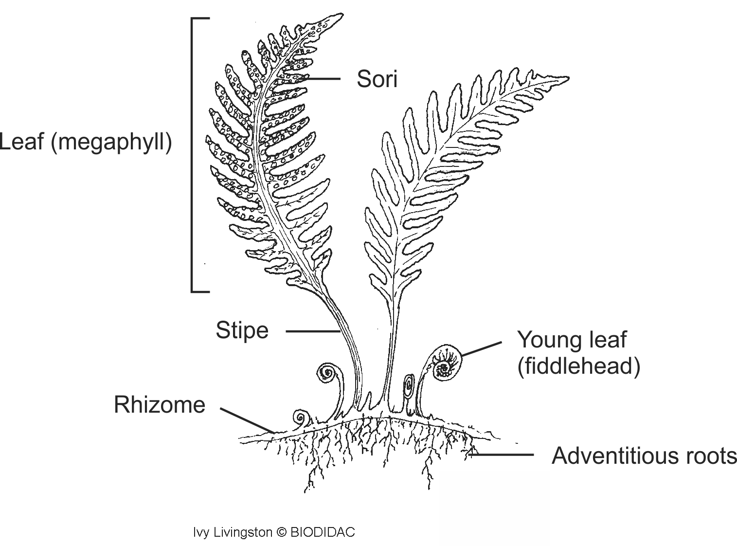 Labels (EN) : Adventitious roots, Young leaf (fiddlehead), Leaf (megaphyll), Rhizome, Stipe, Sori