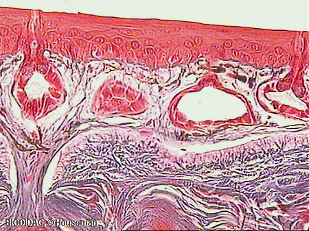 (EN) : Integument (skin): Longitudinal section showing the mucous glands. This skin is a thin, moist, and permeable layer composed of two main layers, epidermis and dermis and it acts as a respiratory surface along with the lungs. It also contains glands that produce mucus and protective chemicals.