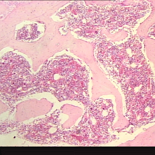 (EN) : Cross section of a pig decalcified bone (Hematoxylin and eosin stain (H&E), x10, Slide RCB-14 I9): Bone marrow is shown.