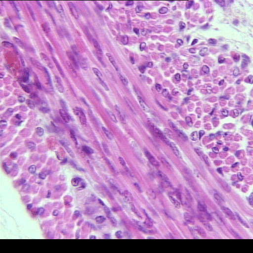 (EN) : Cross section of a rabbit oesophagus (Hematoxylin and eosin stain (H&E), x40, Slide RCB-20 K6.1): Longitudinal and circular muscle fibers are shown.