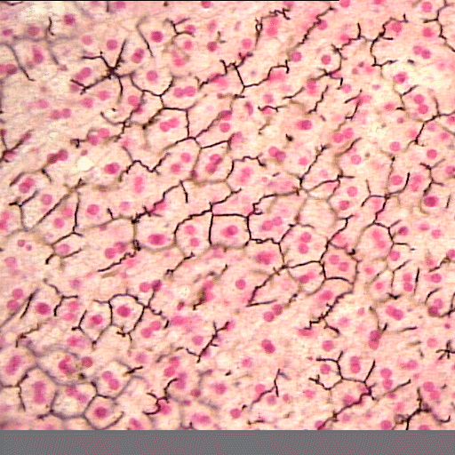 (EN) : Cross section of a rabbit liver (Golgi Silver Reticular Stain, x40, Slide RCB-29 K19.2b): Bile canaliculi (also called bile capillaries) are shown.