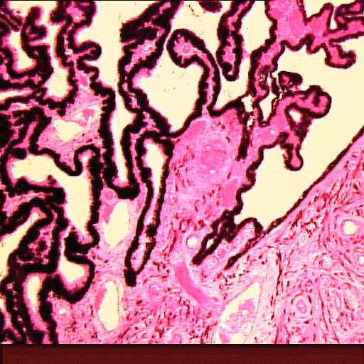 (EN) : Ciliary body from a cross section of the eye from an ox (Hematoxylin and eosin stain (H&E), x10, Slide RCB-45 P3.2).