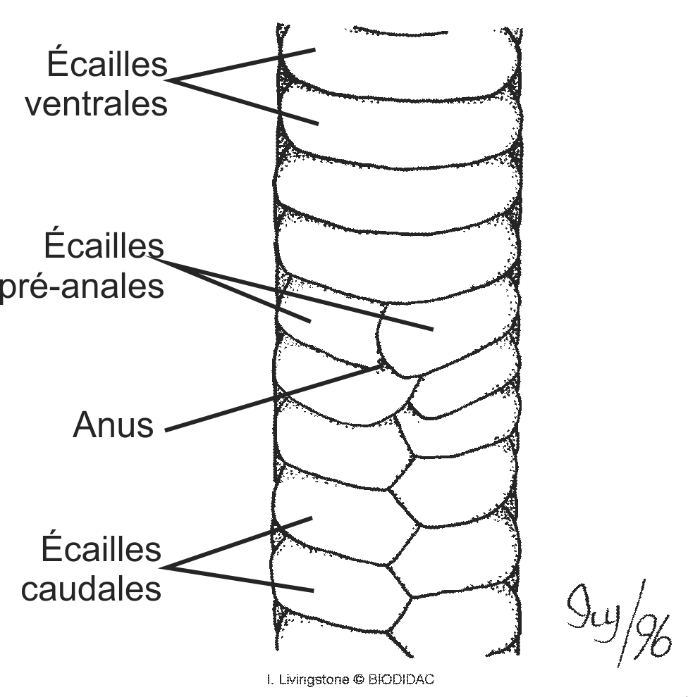 Étiquettes (FR) : Écailles caudales, Anus, Écailles pré-anales, Écailles ventrales
