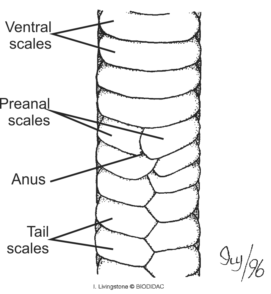 Labels (EN) : Tail scales, Anus, Preanal scales, Ventral scales