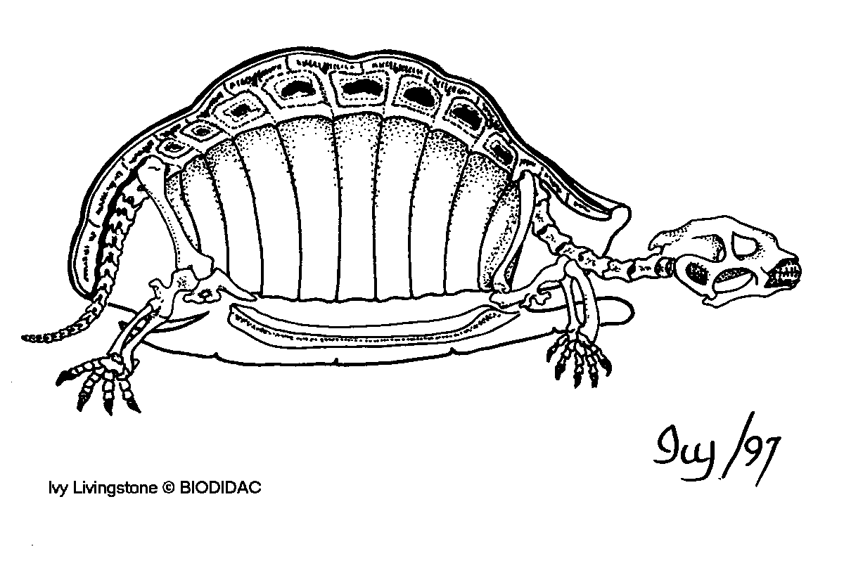 (EN) : Skeleton: Longitudinal section showing the position of the limbs and the shell.