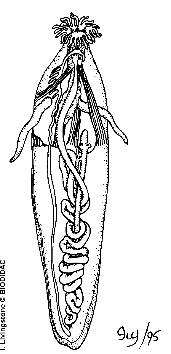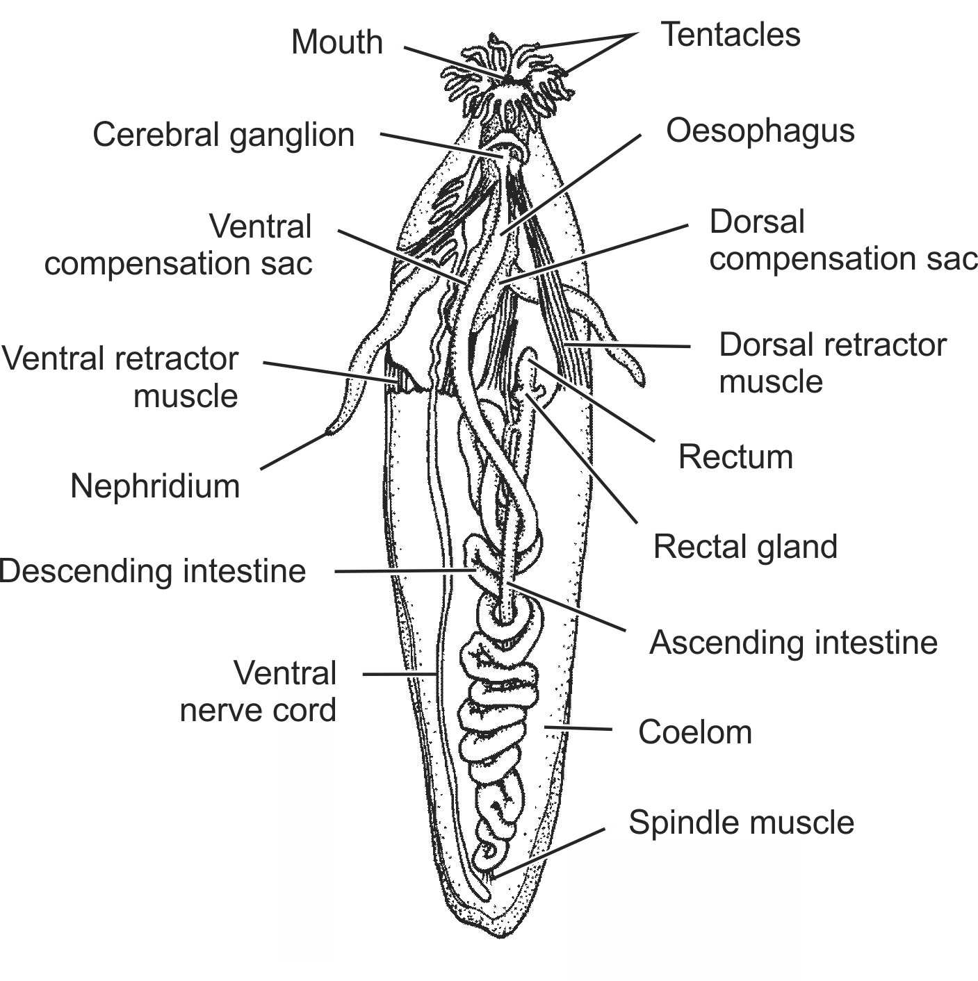 Labels (EN) : Dorsal retractor muscle, Ventral retractor muscle, Mouth, Cerebral ganglion, Ventral compensation sac, Nephridium, Ascending intestine, Ventral nerve cord, Spindle muscle, Coelom, Descending intestine, Rectal gland, Rectum, Dorsal compensation sac, Oesophagus, Tentacles