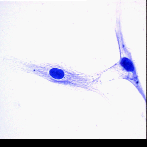 (EN) : Baby hamster kidney (BHK) cell culture (Coomassie Blue, x100-Light microscope, Slide T4-20 A2): 1-day old fibroblast cells showing fibrils.