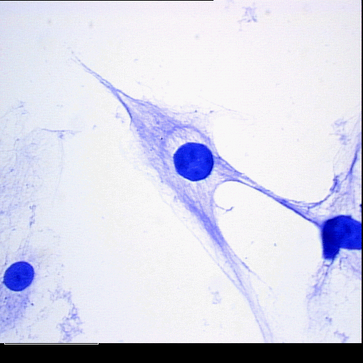 (EN) : Baby hamster kidney (BHK) cell culture (Coomassie Blue, x100-Light microscope, Slide T4-20 A2): 1-day old fibroblast cells showing fibrils.