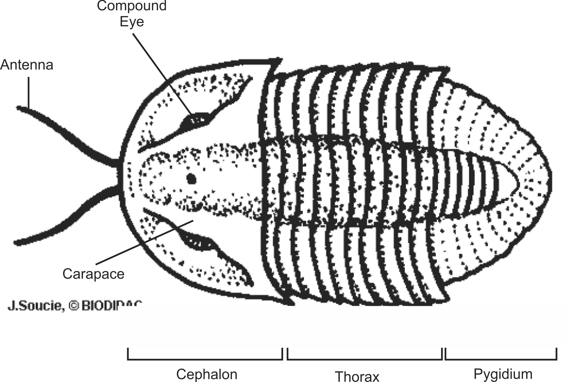 Labels (EN) : Carapace, Pygidium, Thorax, Cephalon, Compound Eye, Antenna